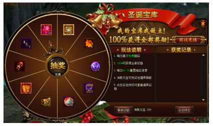 活动期间里,玩家通过圣诞宝库图标进入转盘界面,100%可获得全部奖励。奖励非常丰厚,每天首次免费抽奖。对当前奖励不满意玩家可手动刷新出自己心仪的奖励。