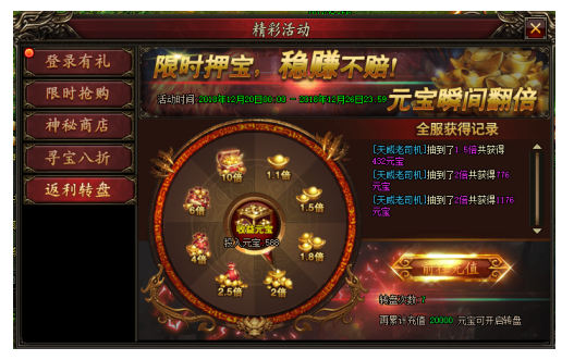 活动期间玩家可通过精彩活动图标进入,满足充值金额即可获得抽奖机会,最低110%返利,最高1000%元宝返利。稳赚不赔,投入的元宝越多,返利的元宝越多!