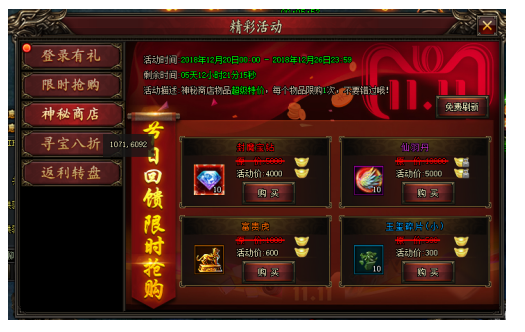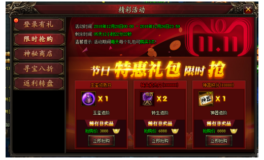 活动期间内,玩家每天拥有3次抢购折扣稀有道具。