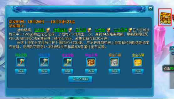 玩家通过活动可以挖到上锁的宝箱,可以活动面板购买钥匙后,即可在炼制获得宝石箱。