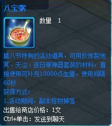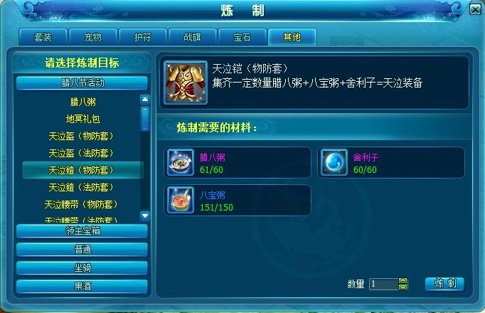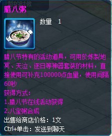 4、新增腊八套装放送活动,1月18日在线期间,集齐一定数量的腊八粥、八宝粥、舍利子即可炼制地冥、天泣、逐日等神器套装。
