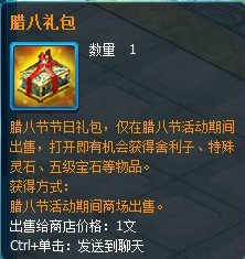 3、新增腊八礼包活动,1月18~28日期间,商场处限时出售腊八礼包,打开即可获得舍利子、特殊灵石、五级宝石等奖励。