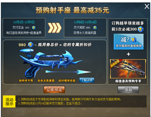 本周预约射手座即可领取抵用券,前3次必中300TZ点抵用券,最高可减35元!还可领取最新史诗武器。每日福利领不停,更新后更可第一时间获得射手座!
