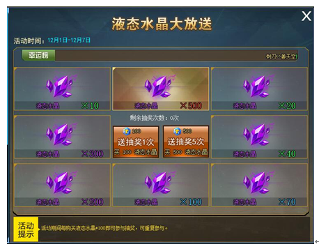 活动期间每购买100液态水晶即可参与1次夺宝,海量液态水晶返还!