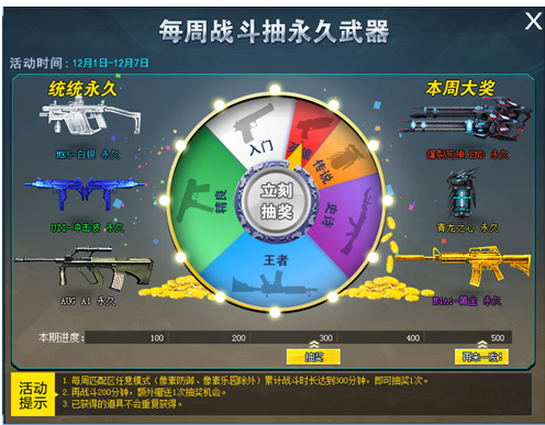 活动期间在指定模式中达到战斗时长,即可抽取永久武器!