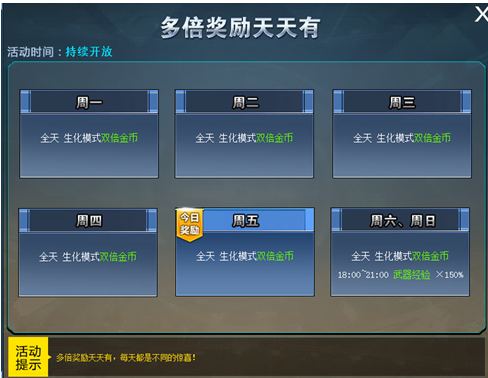 活动期间指定模式金币、武器经验翻倍获取!~