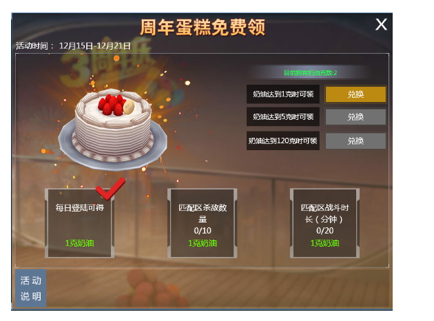 活动期间通过登录、杀敌、战斗时长收集奶油,奶油重量达到指定要求后即可免费领取永久周年蛋糕!
