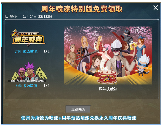 12月15日-12月21日通过周年喷漆免费兑换活动可免费领取!