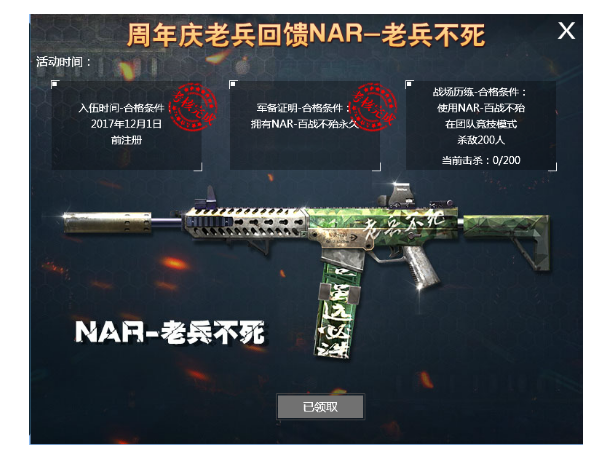 NAR特别版-老兵不死,老兵免费领。三个老兵考核任务,完成2个即可免费领取NAR-老兵不死。