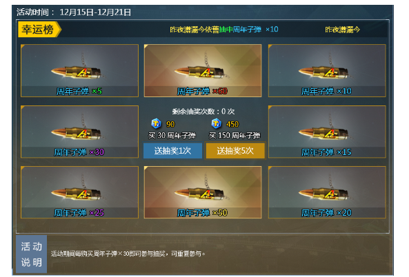 活动期间每购买30周年子弹赠送1次抽奖机会,最高500%返利等你来抽!