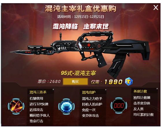 混沌庇护——射击积累能量,能量满后可生成一个布满混沌之力的保护罩,可免疫一次变异体攻击。