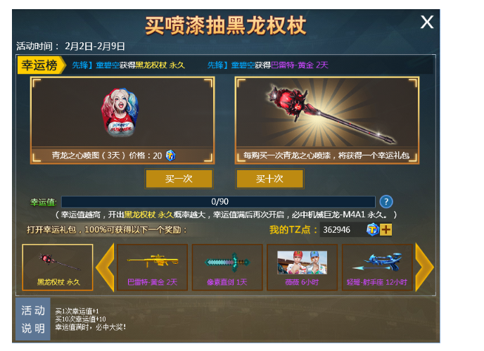 活动期间购买小丑喷漆即可参与抽奖,概率直接获得 黑龙权杖 永久!幸运度满时必中机械巨龙!