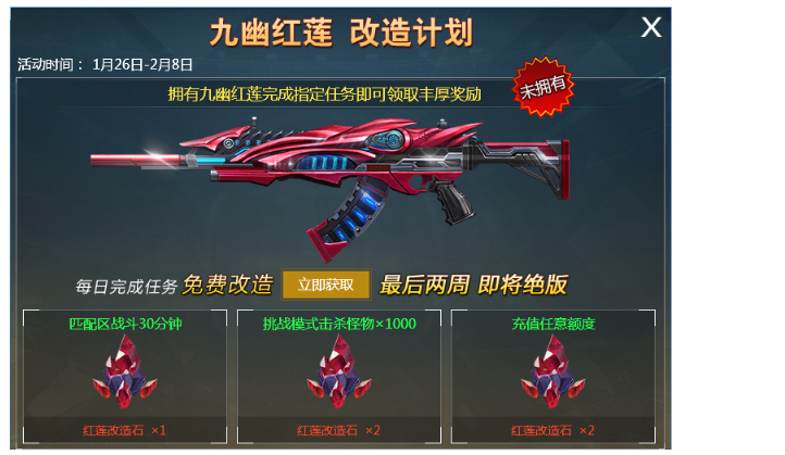 拥有永久九幽红莲的玩家每日完成任务即可免费获得红莲改造石,仅需12天即可免费改造九幽红莲!