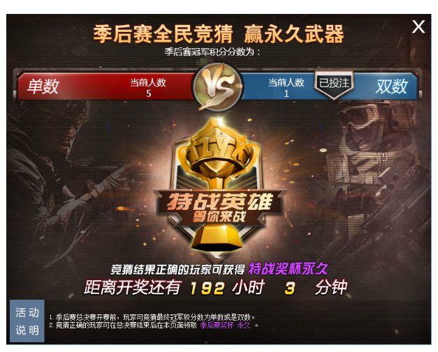 季后赛决赛开始前,所有玩家均可参与竞猜最终冠军的积分数为单数还是偶数!竞猜正确的玩家可直接获得季后赛奖杯 永久!