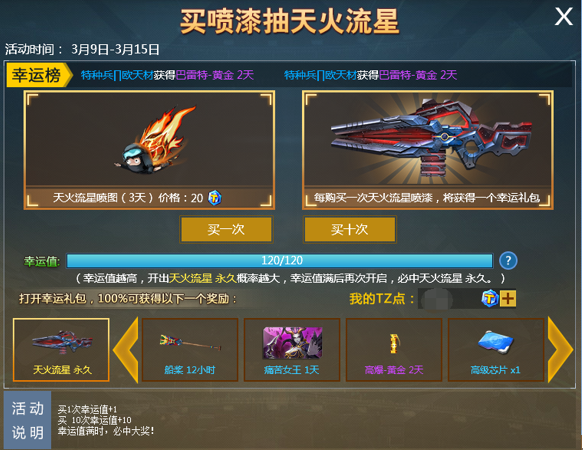 活动期间购买天火流星喷漆即可获赠一个幸运礼包,幸运礼包有机会开出天火流星永久!