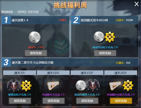 活动期间挑战关卡有好礼,达到指定条件即可领取对应奖励!传说配件等你来开!
