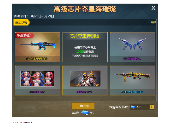 活动期间玩家使用高级芯片可参与夺宝,传说武器星海璀璨、UZI-摩羯座等豪华奖励静待你的到来!