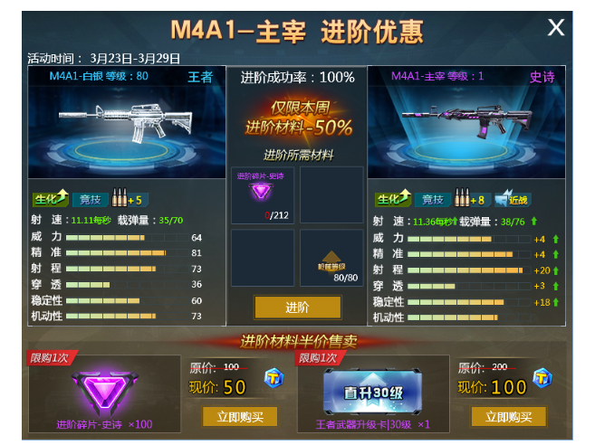 M4A1-白银进阶为M4A1-主宰半价优惠,更有进阶碎片、武器直升卡抄底价售卖!