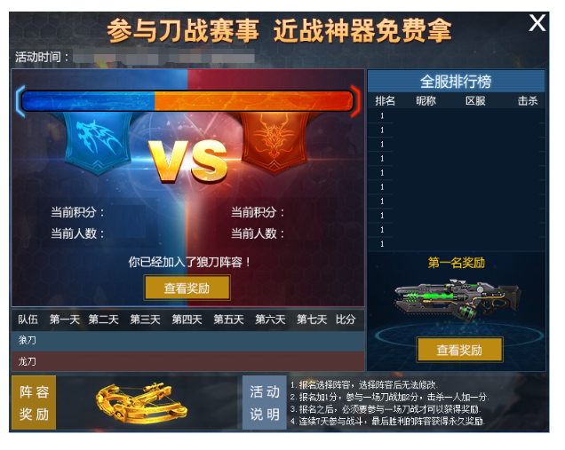 活动期间玩家可选择阵营参与刀战赛事,报名既有阵容奖励!每日排行和胜利更可获得丰厚神秘豪礼!