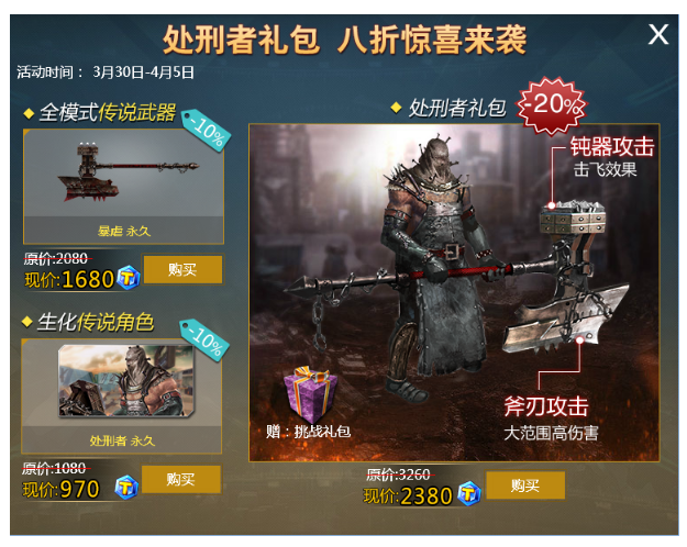 活动期间玩家最低可以8折价格购买处刑者及暴虐,更可获赠价值10元的挑战礼包!