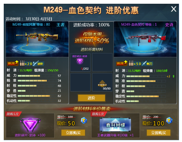 M249-核能风暴进阶为M249-血色契约半价优惠,更有进阶碎片、武器直升卡抄底价售卖!