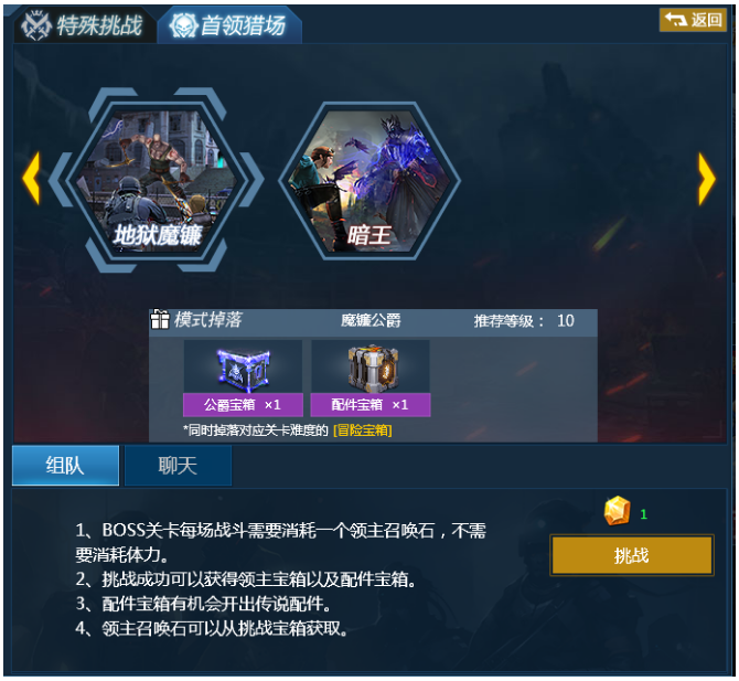 首领猎场-暗王回归。同时我们调整了一下挑战关卡的分类,首领猎场分为单独的一个标签腋下,更加方便玩家选择。首领猎场,地狱魔镰和暗王都新增了配件宝箱掉落,宝箱中掉落全新的配件,新配件可以组合出新的异能。
