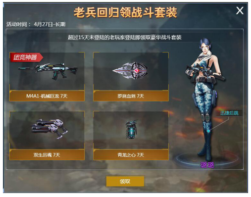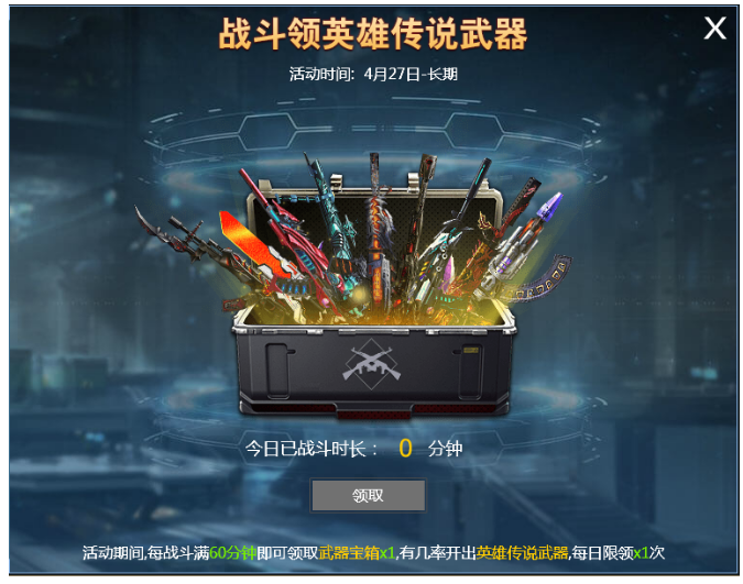 战斗时长领取武器箱,有几率开出英雄、传说级武器。
