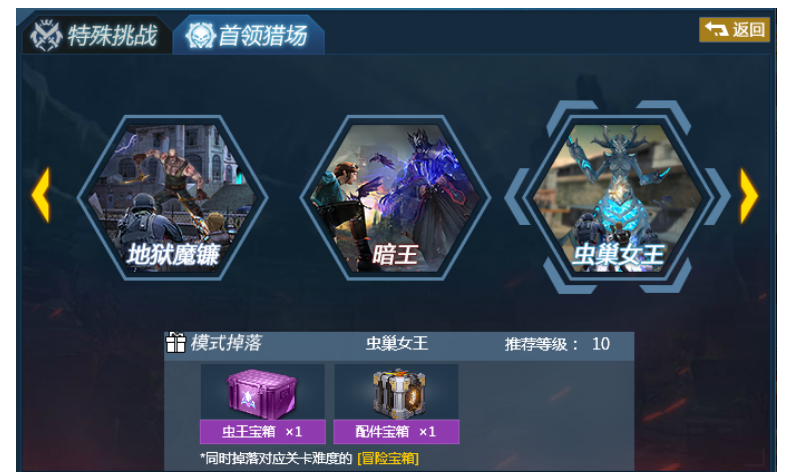 首领猎场-虫巢女王回归。玩家可以通过该关卡获得新的配件和道具箱子。