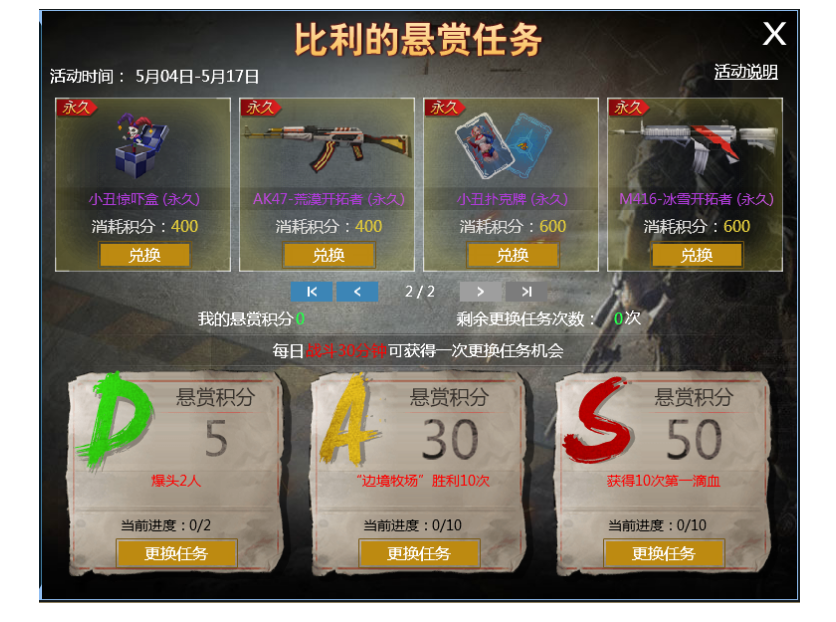 增加了全新的D级难度,以让新手玩家和休闲玩家也能够较为容易的获得积分。任务奖励全部为永久物品,包括:小丑套装,开拓者武器,和绝地求生角色-南佳织。还有全新史诗级武器:AWM-丛林开拓者(永久),只在比利的悬赏中产出。