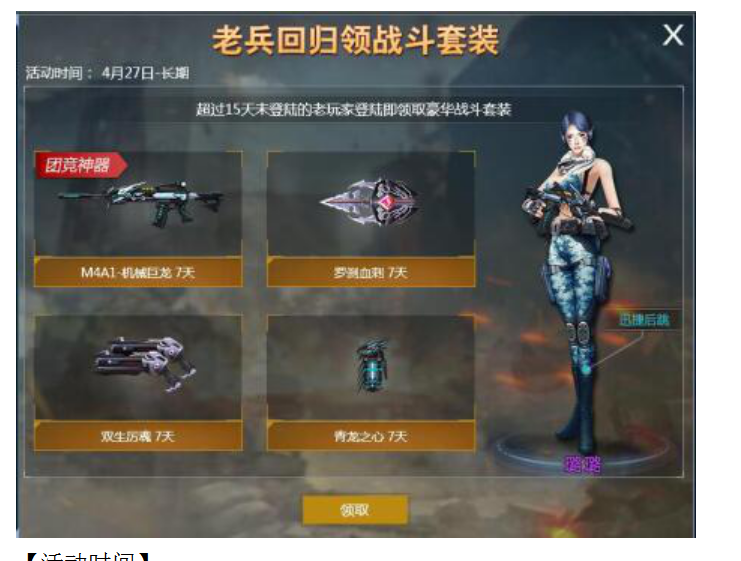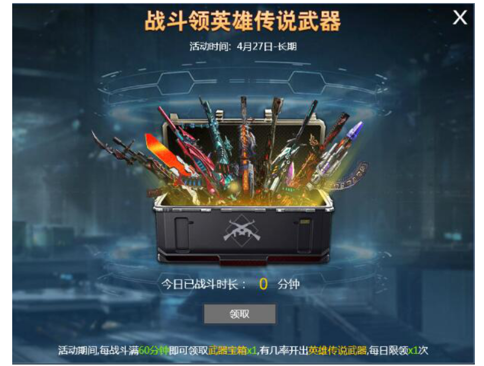 战斗时长领取武器箱,有几率开出英雄、传说级武器。