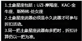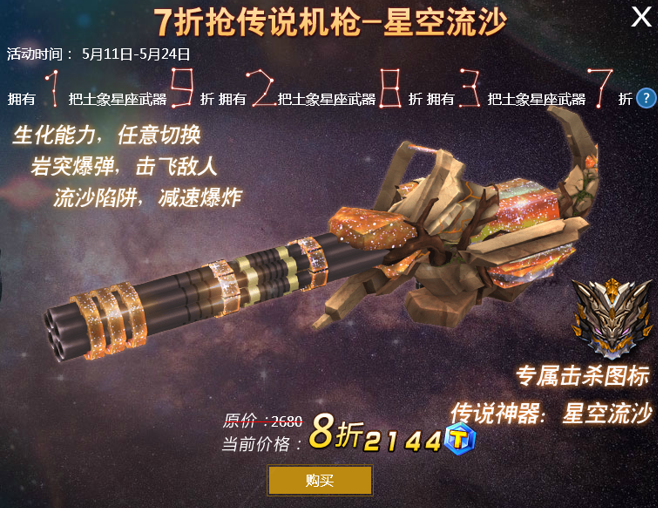 星空流沙为土象星座武器,玩家拥有的归属于土象星座的永久武器越多,就能享受越高的折扣,最多可享7折购买星空流沙。