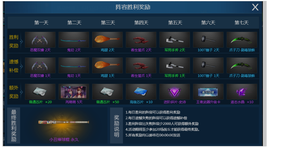 6. 一周内最少参与20场游戏才可以得到最终大奖。