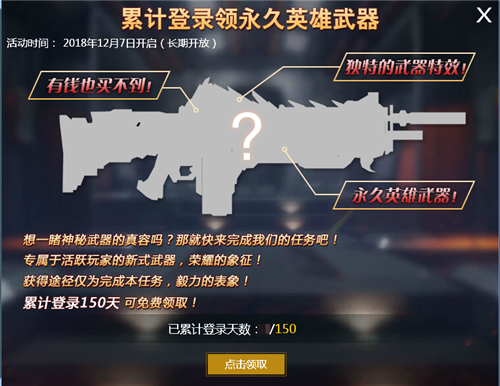 1.活动期间,玩家累计登陆150天即可领取永久英雄武器一件;