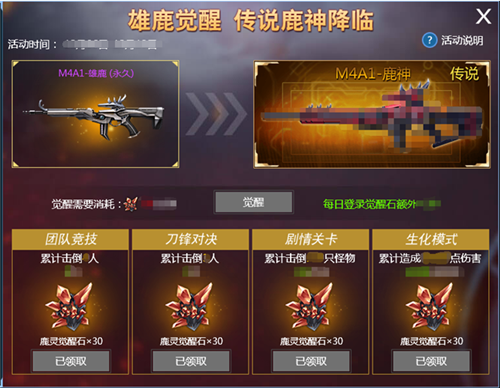 2.每日登录可以自动获得一定数量的“鹿灵觉醒石”,觉醒石用于将“M4A1-雄鹿”觉醒为传说武器“M4A1-鹿神”;