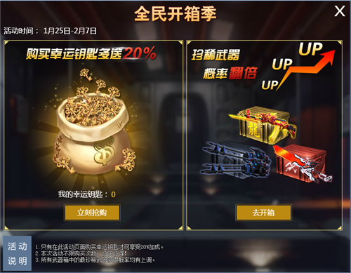 活动期间,在本活动界面购买幸运钥匙可享受额外20%加成,多买多得!此外,武器箱中最珍稀武器获得概率全部上调,还在等什么,抓紧机会抽取你心目中的武器吧!