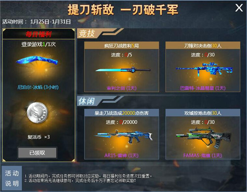 1.活动期间内,完成任务即可领取对应奖励,每日福利任务进度次日重置;