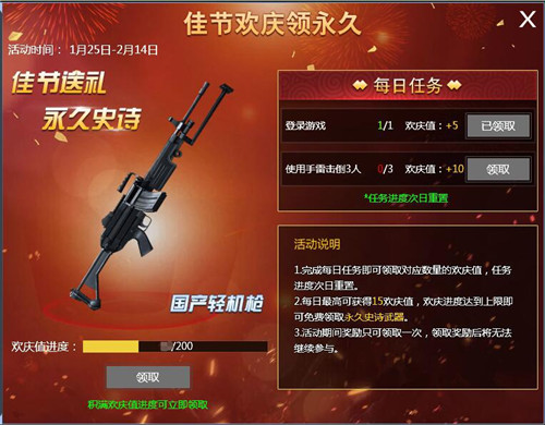 为了迎接即将到来的春节,本次活动也为大家带来了新型的永久史诗武器,只需每日完成任务即可轻松获得,赶快参与吧!