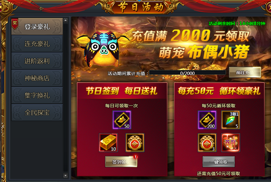 1、 在活动期间登录游戏即可领取豪华大礼,每充值50rmb可以循环领取充值奖励,活动期间累计充值2000rmb可以领取极品萌宠,活动期间累计充值10000rmb可以领取极品武器时装(开服时间大于=1天的服务器可以参与)
