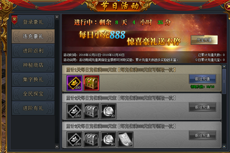 2、 连充豪礼,活动期间单日累积充值888元宝即可领取连充奖励,单日最多可领取10次;活动期间累计充值天数越多,奖励越丰厚(开服时间大于=1天的服务器可以参与)
