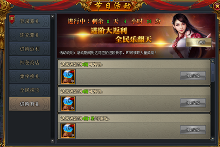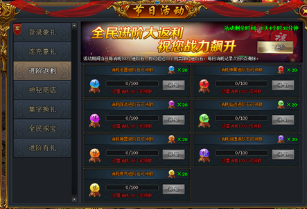 3、 活动-进阶返利;活动期间当日消耗对应进阶线的进阶材料没达到100个可以获取20个对应的进阶材料(开服时间大于=4天的服务器可以参与)