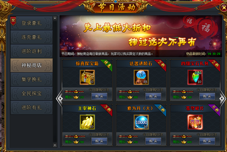 4、 活动-神秘商店;活动期间玩家可以在神秘商店中购买超值商品,商品每日有限购次数,商品每日刷新重置。(开服时间大于=4天的服务器可以参与)
