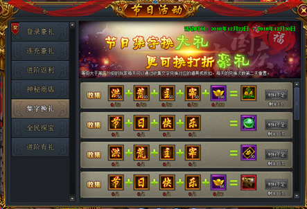 5、 活动-集字兑换;活动期间玩家通过击杀怪物可以掉落收集并消耗字和元宝进行兑换超值物品,每日兑换有次数限制,节日绝版称号限时兑换(终身只能兑换1次)(开服时间大于=4天的服务器可以参与)