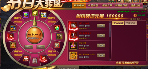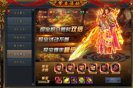 6、 活动-全民探宝;活动期间内玩家累计一定的探宝次数可以获得丰厚奖励;活动期间探宝获得的探宝积分双倍,探宝的爆率翻倍;(开服时间大于=15天的服务器可以参与)