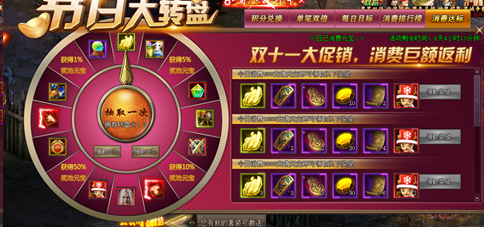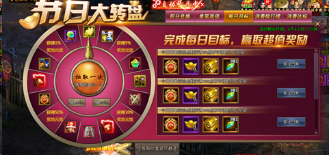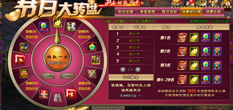 1、 活动期间内玩家可以消耗转盘令进行抽奖,抽奖可以获得稀有时装,主宰装备,奖池元宝等稀有道具(开服时间大于=1天的服务器开放)