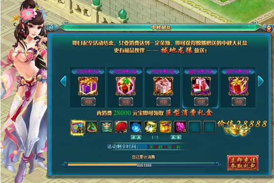 活动内容:每充值15元宝即可额外获得1个中秋大礼包,有几率获得“紫色羽翼石”道具,可将金色翅膀神炼为紫色品质(属性将大幅提升)。