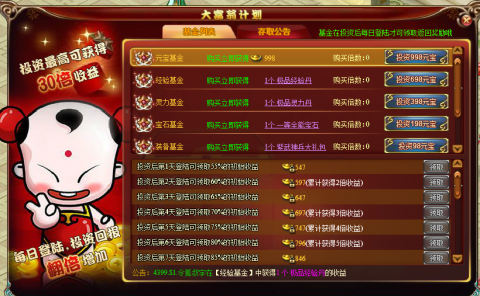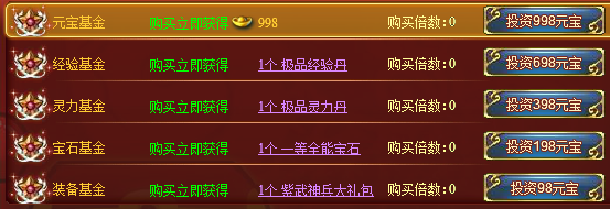 1. 花费少量元宝购买基金,可获得大量元宝和稀有道具返还