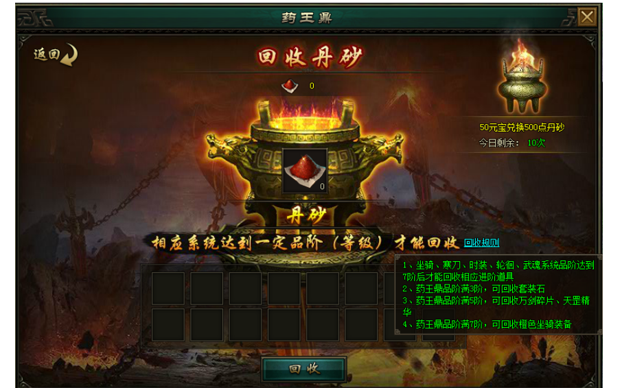 药王鼎的最后一个系统,是我们的回收系统。是丹砂的产出途径,进阶材料就可以进行回收累积丹砂。坐骑进阶丹、金蚕丝、寒刀结晶等进阶系统材料,套装石,甚至连万剑碎片、天罡精华、坐骑装备也可以回收!可换取大量丹砂用于丹药重炼。更可使用元宝兑换丹砂,每日可兑换10次,性价比超高!