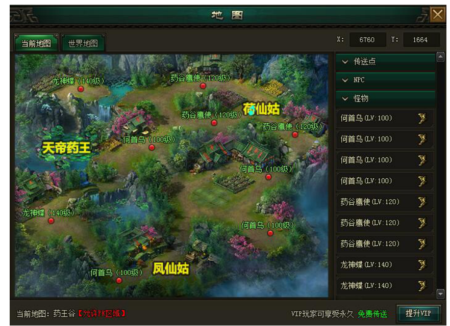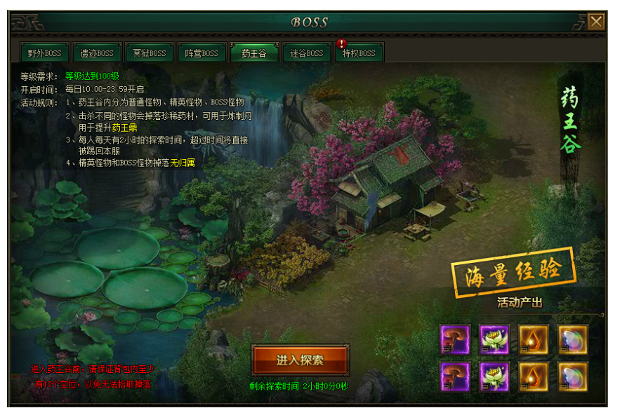 药王谷为免费跨服地图,玩家每人每天有2小时的探索时间,超过时间将自动传送回本服。进入击杀boss、精英怪、小怪可获得海量经验,每日必挂之地。