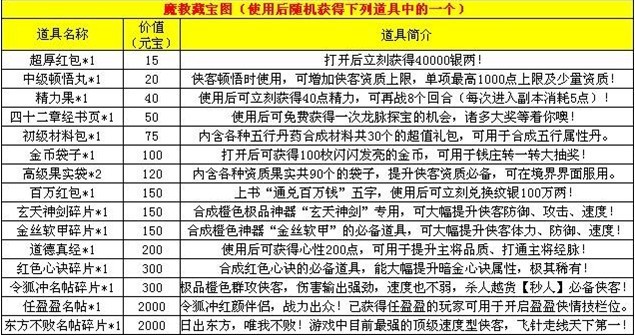 - 生财有道:周伯通虽然童心未泯,其实他在经商方面有很高的造诣,最近他发现一个生财的方法,请求玩家收集西域贡品(击败宿敌100%掉落),每交付一个西域贡品,可获得银两5W(一天最多可以交付10次)