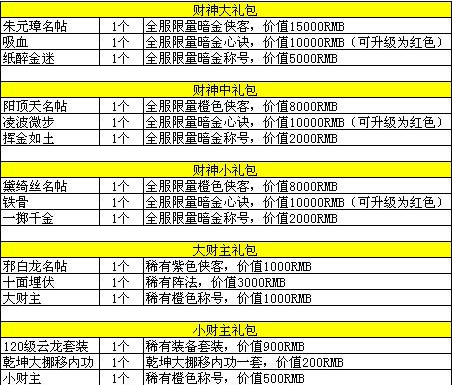 全区全服充值元宝数量大于10000元宝即可入榜财神金榜排行榜,按以下名次进行奖励: